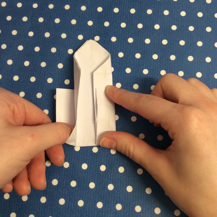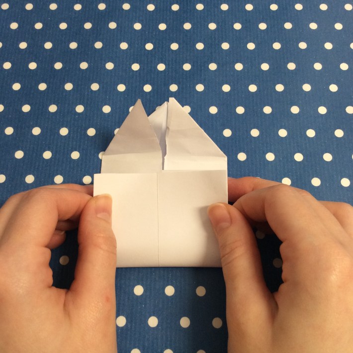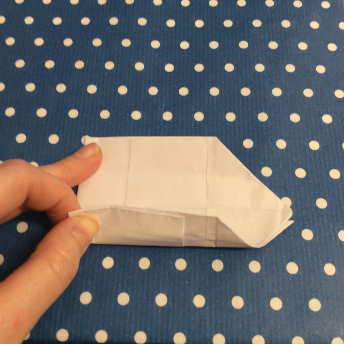Take the right corner and make a little triangle (16) – push gently down so that it creases (17) and do the same to the other side (18).