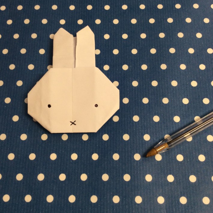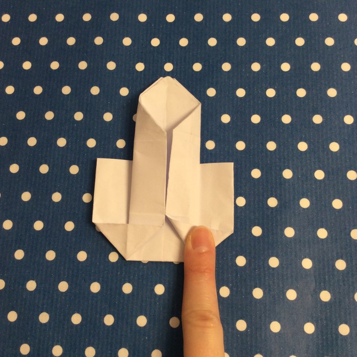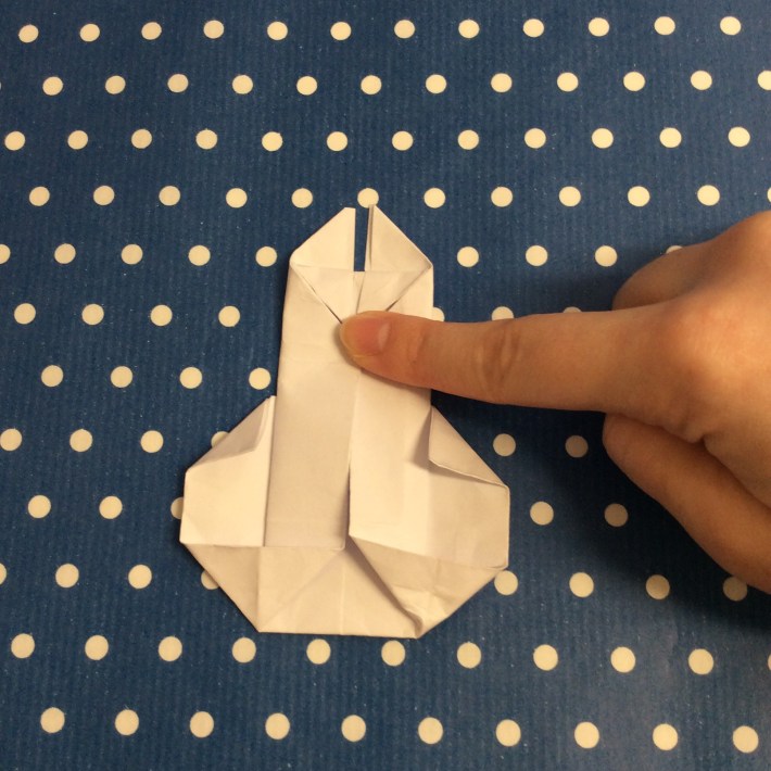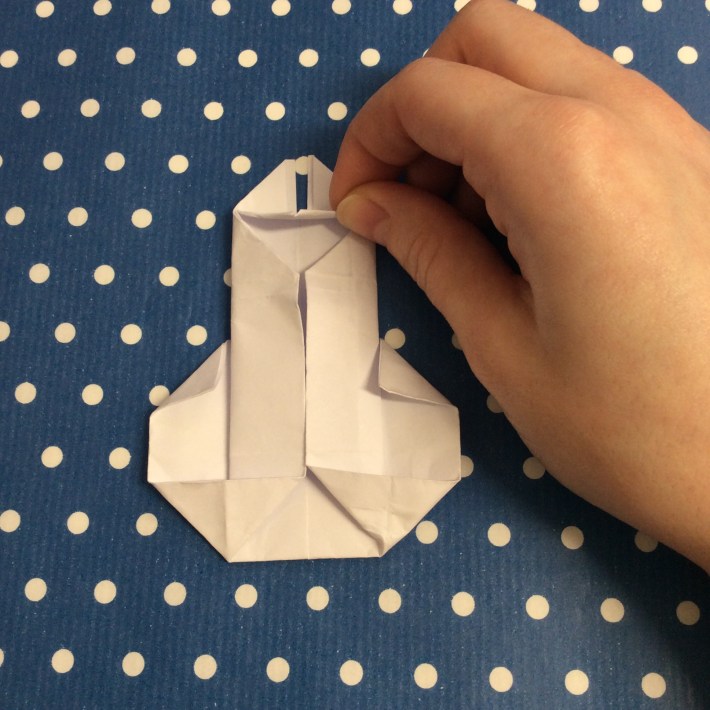 Take the very top triangle (19) and push down so that it creases (20). Then, take the ears and fold them so that they turn into tiny triangles (21) – do this to the other side (22).
