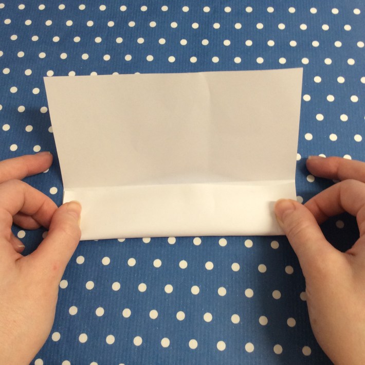 Start with a square piece of paper – we used 15cm X 15cm. Fold the paper in half (1). Then unfold the piece of paper and fold the top half and the bottom half to the creased centre line (2 & 3).
