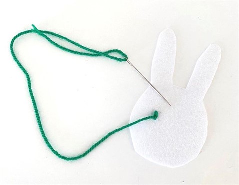 This is where Miffy comes to life! You should make sure to complete the next few steps with the help of your parent or guardian. With a pencil, mark where you want Miffy’s eyes and mouth. Then thread your needle with your green yarn and create the eyes by going over a simple stitch a few times. For the mouth, simply stitch a cross!
