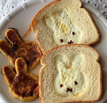 - Place the bread on a low-heat buttered pan. Then, crack an egg (only using the white) in the centre of the Miffy-shaped gap. Season to taste and cover for 5 minutes.