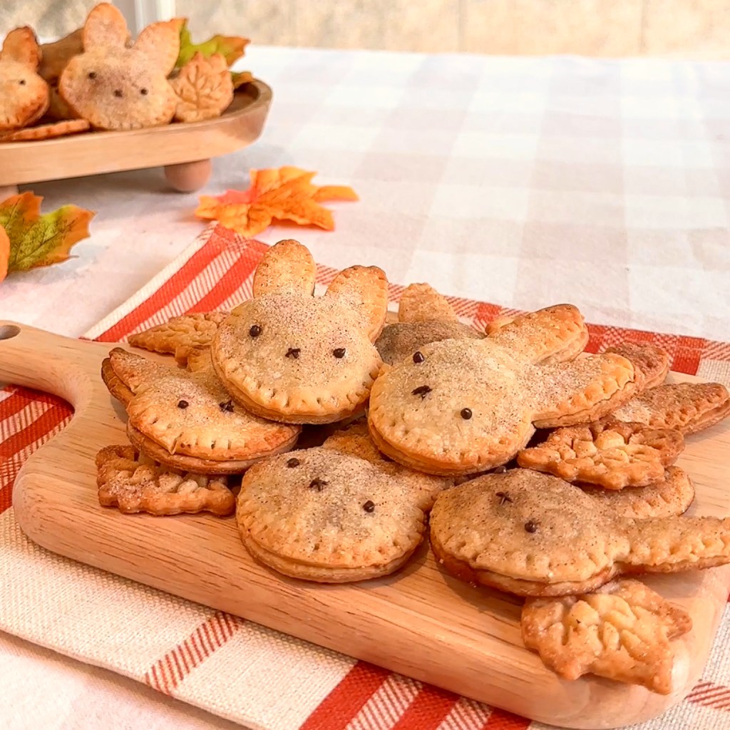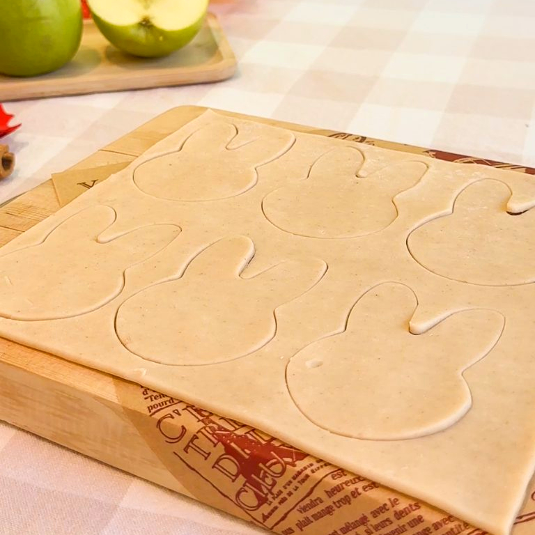 - Use a rabbit‑shaped cookie cutter (or a template shaped like Miffy) to cut shapes from the crust. Place about ½ tablespoon of filling on one shape, then cover with another crust shape and press the edges with a fork to seal. Avoid over‑filling so the edges seal well.