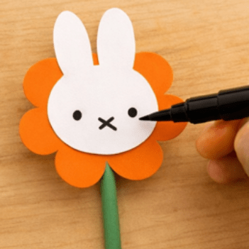 Glue the petals together in a circle. Then attach Miffy’s head in the centre. Press gently until secure. If you like, attach a green pipe cleaner or craft stick to the back as a stem. You can also add leaves using green paper.